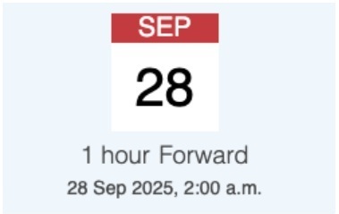 Sunday, 28 September 2025, 2:00:00 a.m. clocks are turned forward 1 hour to