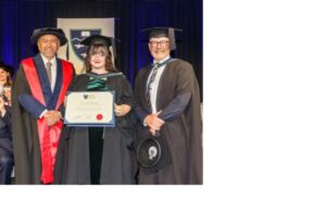 式典では一人一人がアカデミックガウンに身を包んで登壇し、クリス・コリンズ学長とジョー・ダルン学部長から戴帽を受け、卒業証書を手にしました。
